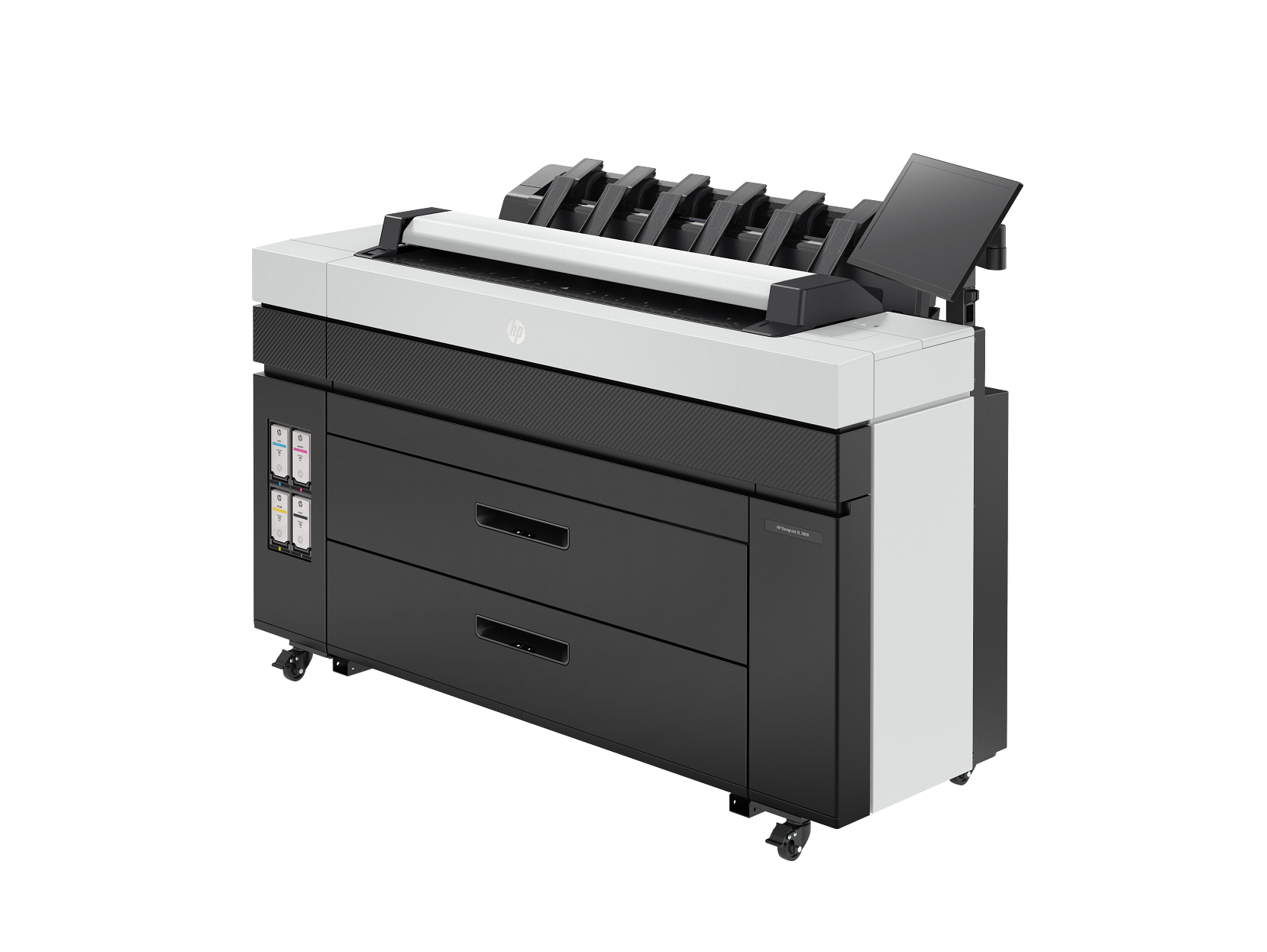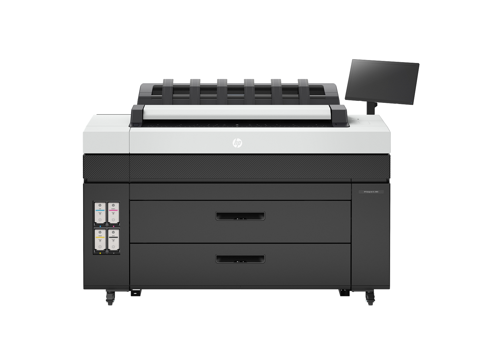 Impressora multifuncional HP DesignJet XL3800, cabeças de impressão (6), cartuchos de tinta introdutórios (4), folha de calibração do scanner, documentação, cabos de alimentação, cartucho de manutenção, empilhador, cesta traseira, painel de controle, braço do monitor