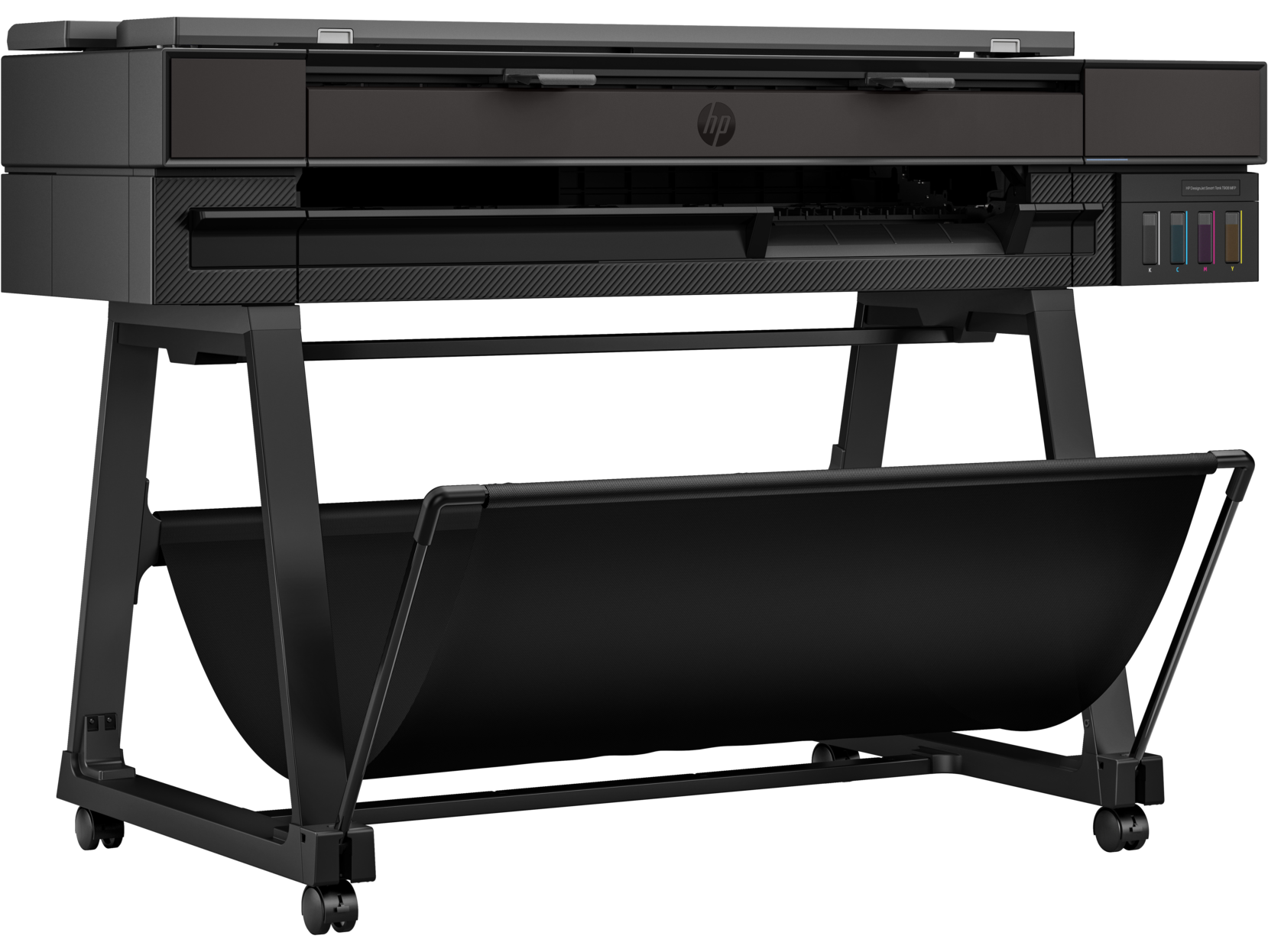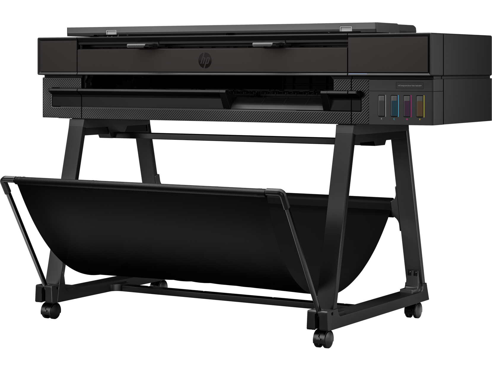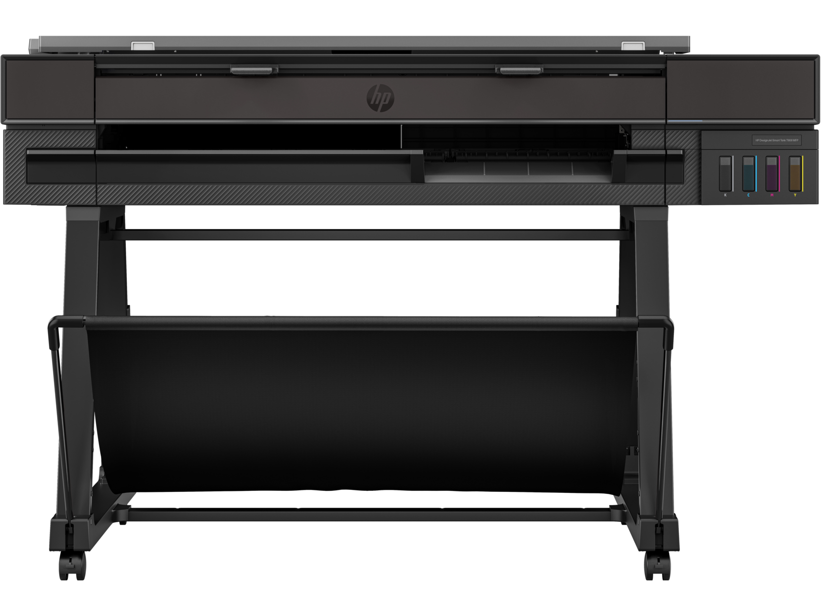 A caixa contém: impressora HP DesignJet Smart Tank T908 MFP, cabeçote de impressão, garrafas de tinta, pedestal da impressora, eixo, guia de uso, pôster, folheto de garantia e cabo de alimentação.