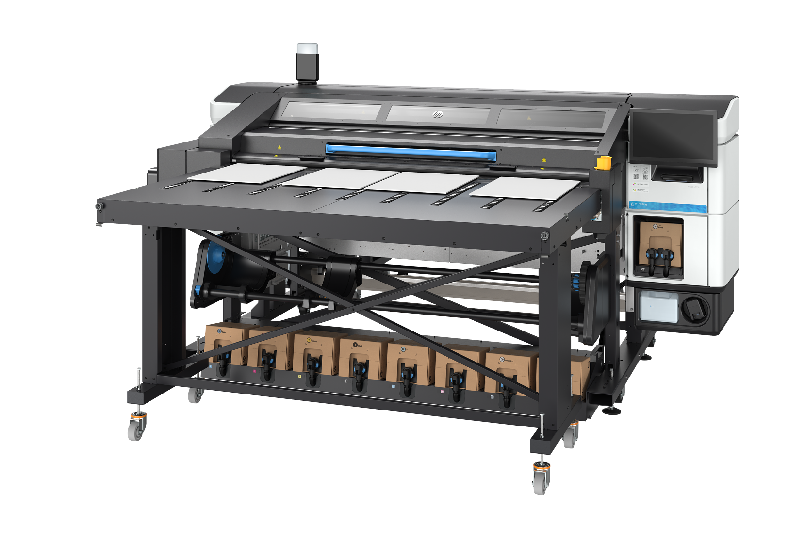 Impressão híbrida: suporte para materiais flexíveis (rolo) e rígidos (placas).